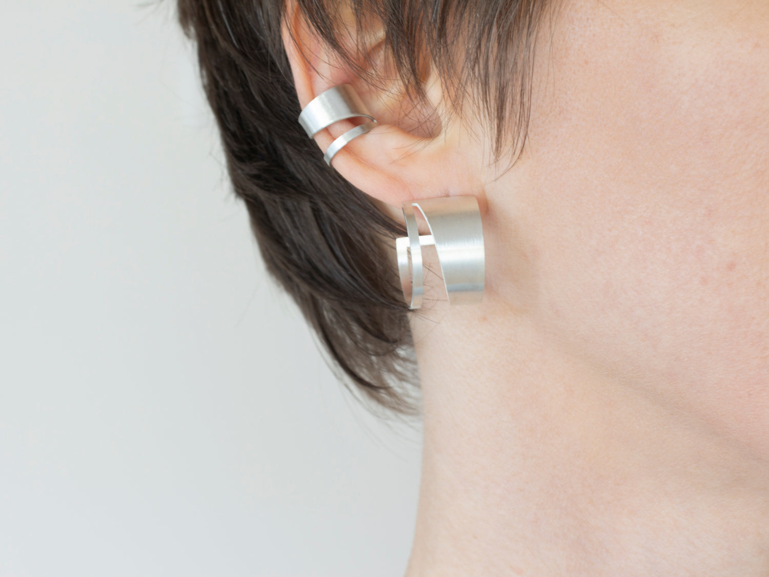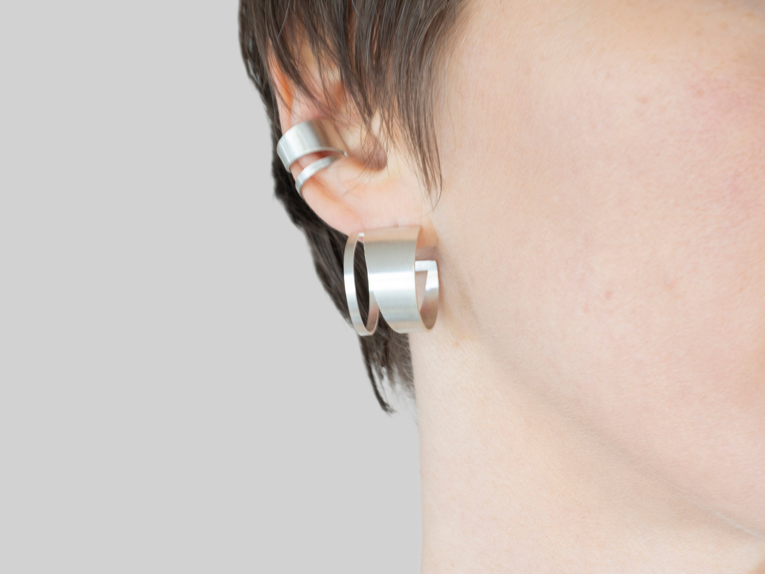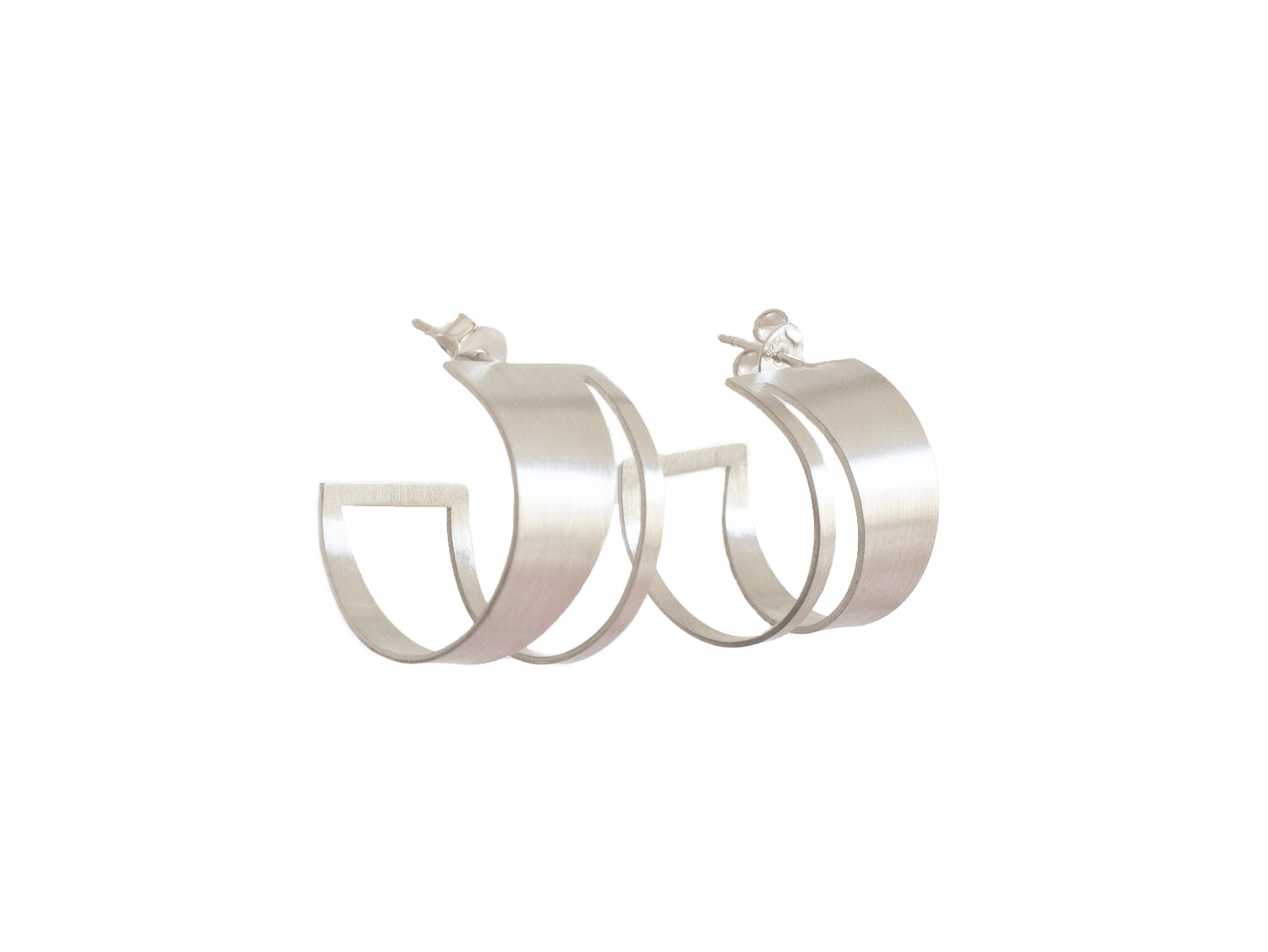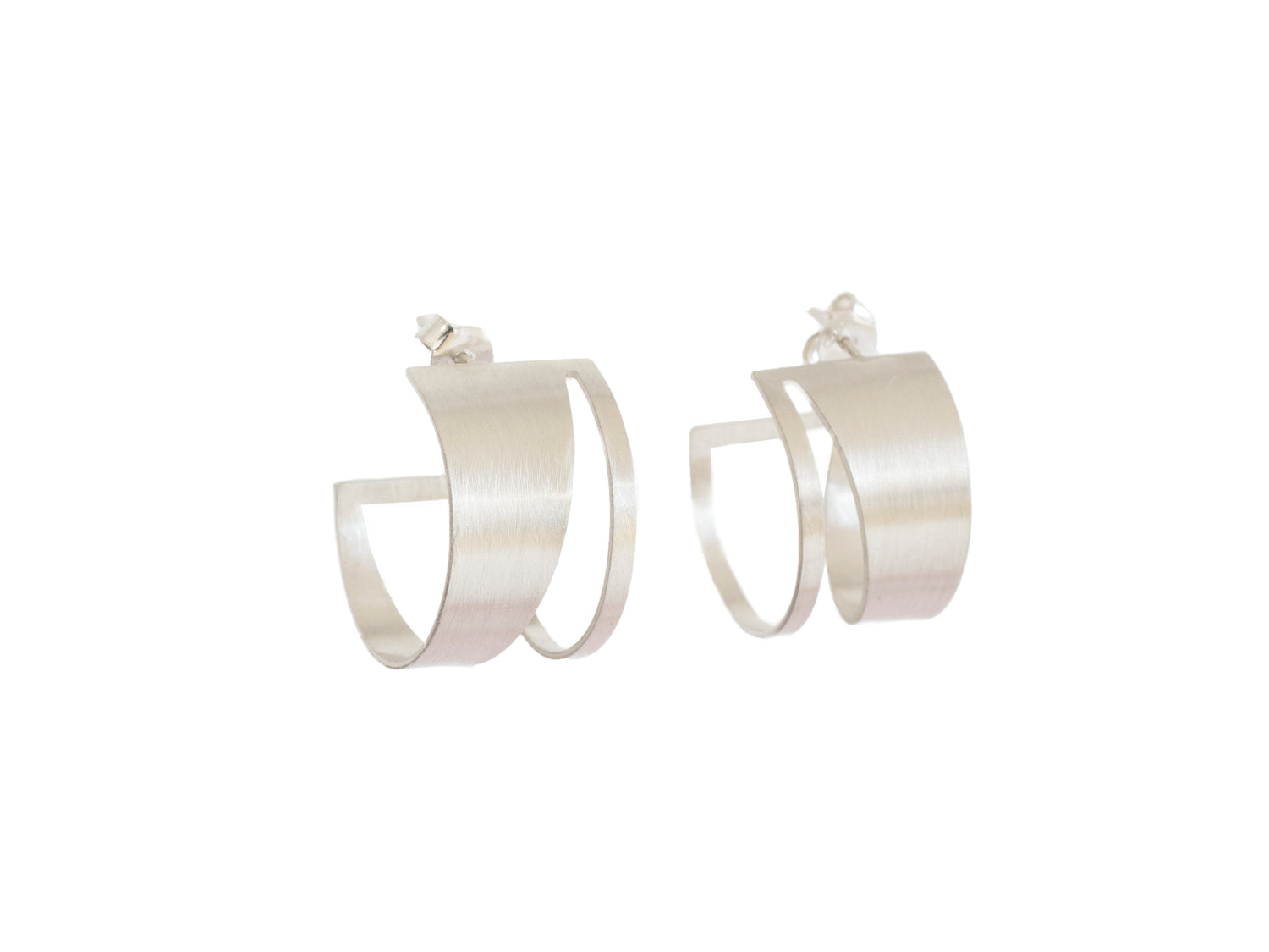 Earrings are around 2 cm (0.8 in) wide and hoop is around 2.5 cm (1 in). They come with brushed finish just to emphasize the form and sculptural shape.
